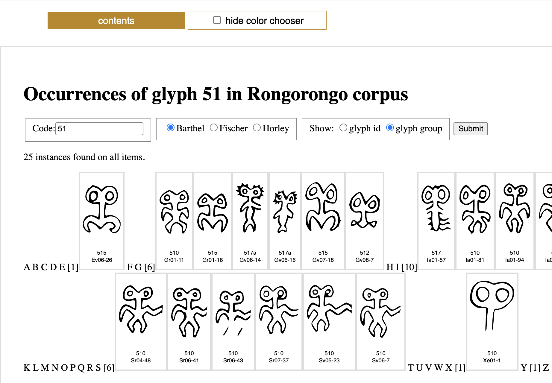 Up until now the glyph index showed all glyphs with the id number used to uniquely identify them in the corpus. I have now added an option to show Horley’s glyph group numbers instead. Below is an example of what results look like when this option is chosen.